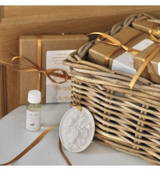 Ce médaillon en plâtre est présenté dans un petit coffret dans lequel vous trouverez aussi un flacon de parfum Ambre, fragrance feutrée et enveloppante pour l'hiver, d'une contenance de 10 ml.
